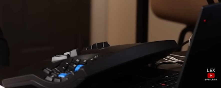 Lex plants a Kinesis Advantage in full view. Its split wells and blue thumb clusters sit there like a quiet declaration: long hours, serious focus, no compromise.